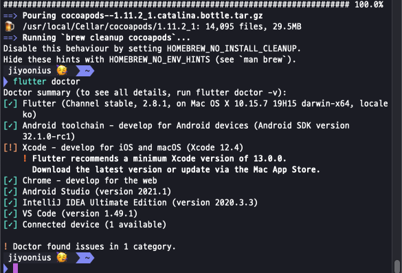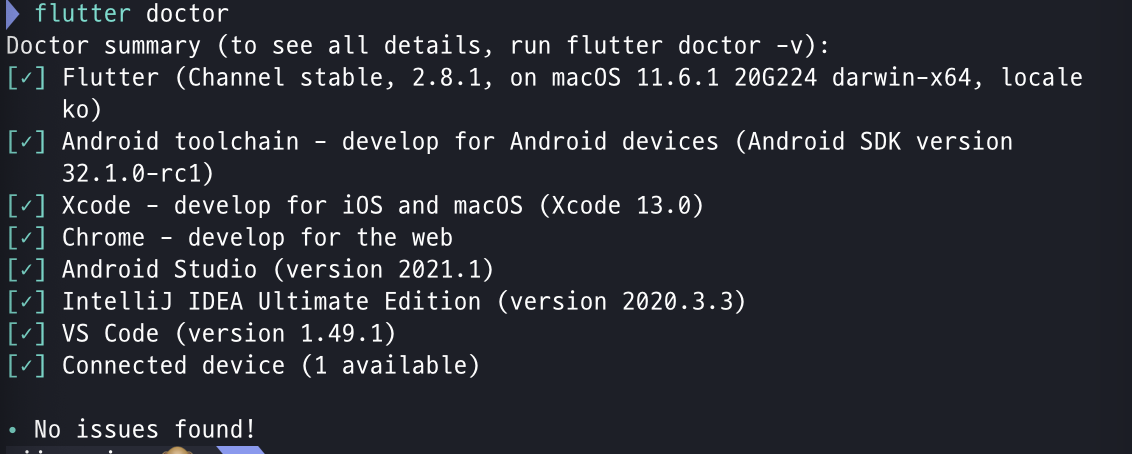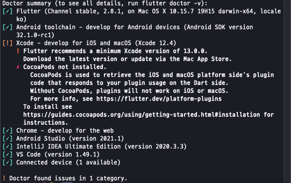 이렇게 flutter실행을 위한 준비단계가 다 끝난 듯 한데 확인을 위해 아래의 명령어를 실행한다