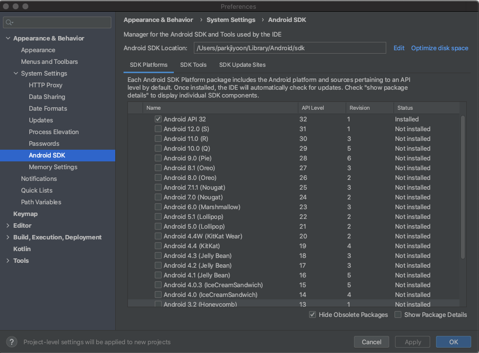 SDK Manager에 들어가면 다른버전을 다운받을 수도 있다