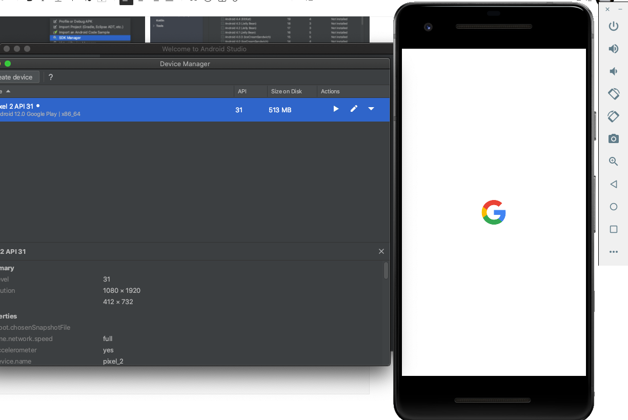 이제 실행을 누르면 옆에 디바이스가 뜨는걸 확인 할 수 있다