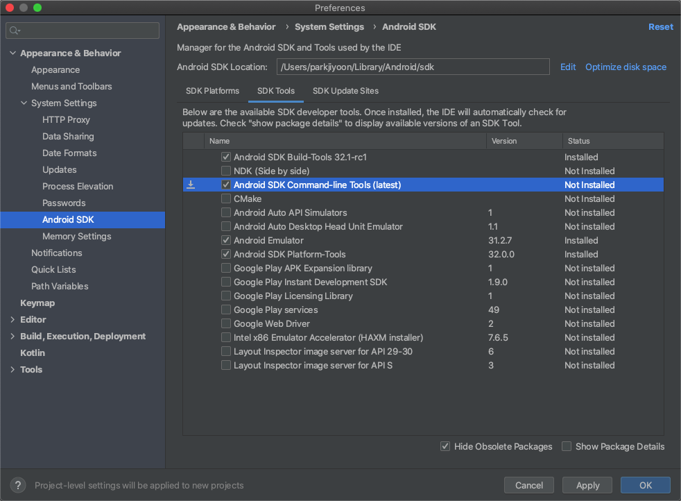 SDK Manager 들어와서 SDK Tools 들어간 후 Android SDK Command-line Tools 체크