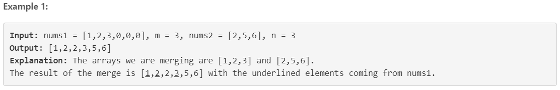 주어진 배열 nums1과 nums2는 순서대로 정렬되어있으며, Integer m과 n은 각각 nums1과 nums2가 가진 element의 수를 의미한다.