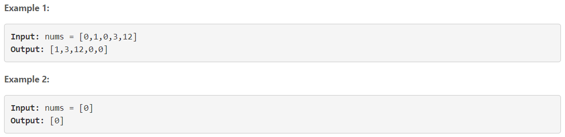 nums에 0 하나만 들어있는 경우와 그렇지 않은 경우로 나누어 생각하고 코드를 작성하였다. for문을 돌려서 배열에서 0을 발견하면 배열 zero에 모아주었고, 0을 빼면서 -1 된 배열의 길이를 고려하여 마지막에 i--;를 해주었다. 0이 빠진 nums와 0을 모아둔 배열 zero 합쳐 return.